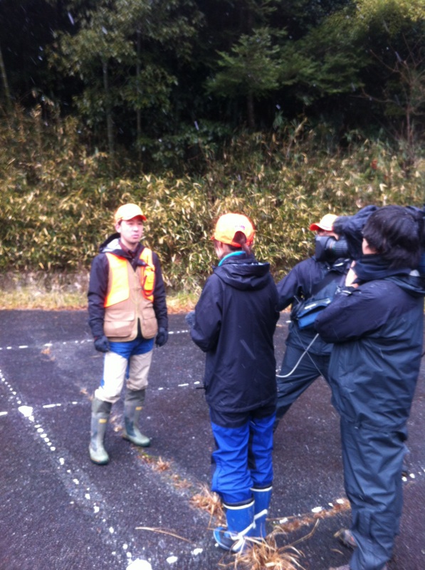 まずは、朝8時に夢前町で合流しディレクターの女性の方から挨拶を受け、カメラさん、音声さん、ドライバーの4名で取材開始、青年部の共猟会の様子を撮影されました。取材のお目当ては、今年始めた若手女性ハンターOYさんの密着取材でした。狩猟の現場に入って待場の取材で、雪が降る中10キロのカメラを持って山登り、3時間ほど待機しておりました。結局、カメラの前には獲物は出ませんでしたが、十分雰囲気は伝わったと思います。